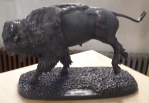 Bison aus Bronze: Minos, ein Bison aus Bronze stand alleine in seiner Ausstellung und ihm war langweilig. Da fiel ihm ein, dass er sich ja aus der Bronzehülle befreien konnte und er tat es auch. Schon bald hatte er sich befreit und von der Hülle waren nur noch Bronzestücke übrig. Fröhlich hüpfte er von seinem Sockel herunter und sprang zur Tür. Mit gesenkten Hörnern rannte er auf die Tür zu. Mit einem lauten Knall flog sie auf und zerfiel in tausend Stücke. Überglücklich rannte er hinaus in die Stadt und verschwand. Schnell sah er ein Feld mit Gras und war schon dort. Hinter sich hörte er lautes Rattern und er sah einen Mähdrescher. Sofort rannte er weg und rannte in einen Elektrozaun. Mit lautem Knistern rannte er wieder weg. Schon wieder hörte er Hupen und sah, dass er auf einer Autobahn war. So schnell er konnte, rannte er zum Rand der Autobahn. Nach einer halben Stunde kam er zu ein paar Metallstäben und stolperte über sie. Diesmal hörte er Elektroknistern und sah, dass er auf Zugschienen stand und er rannte davon. Als er aufsah, sah er, dass er wieder vor dem Museum stand. Glücklich hüpfte er auf sein Podest.