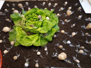 • Ein Bauer wohnte in einer Bauernhütte. Der Bauer hatte viel Salat. Eines Tages kam eine Schar Schnecken. Sie frassen das ganze Salatbeet auf. Der Bauer sagte:“ Hei, wo ist mein Salat?!“ Er ging näher an das Salatbeet heran und sah dort eine Schneckenplage. Er rannte ins Haus und nahm einen Salat. Er rannte wieder hinaus und setzte den Salat ins Beet. Die Schnecken krochen an den Salat. Der Bauer hob den Salat mit den Schnecken daran auf und brachte die Schneckenplage zum Nachbarn in den Garten. Und so lebten die Schnecken glücklich in Nachbars Garten.