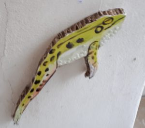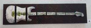 ♠ Das Kunstwerk ist sehr breit. Es gibt Bilder mit Fäden oder Collagen, bearbeitete Bilder auf dem Computer oder Fotografien aber natürlich auch handgezeichneten Bilder. Dieses Werk, über das ich schreibe, zeigt eine E-Gitarre. Die Künstlerin Sarah Huber hat diese E-Gitarre gezeichnet und gab ihr den Namen «Saitenliebe». Dieses E-Gitarre besteht aus Holz in acht Teile aufgeteilt, es hat 8 Saiten. Die Holzstücke sind auf eine Metallplatte angebracht. Das Bild ist 50cm lang und 10cm hoch, das Werk hat einen Verkaufspreis von 850 Franken. Sarah Huber ist Lenzburgerin. Zudem ist sie Sängerin und Songwriterin. Sie steht seit 20 Jahren auf der Bühne. Die Liebe zur Sprache, Musik und zur Kunst hat sie durch ihre Studienabschlüsse an der Uni Zürich und an der Zürcher Hochschule der Künste begleitet. Ihre Kunst soll das Wundervolle der Welt und was Musik darin auflöst darstellen. Tom