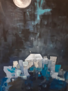 In dieser Zeichnung kann ich verstehen, was gezeichnet ist, obwohl sie nicht klar gezeichnet ist. Die Farben hier sind: blau, hellblau, dunkelblau, weiss, schwarz, grau, hellgrau, dunkelgrau, hellbraun und andere verschiedene Blautöne. Aus diesen Farben können wir erkennen, dass es Nacht ist. Auf dem Schloss hat es eine kleine Flagge, man kann aber nicht erkennen was für eine. Die Häuser sind sehr fantasievoll gezeichnet. In diesem Bild fühle ich ein ruhiges Gefühl, weil es Nacht ist und alle schlafen. Die Farben finde ich echt gut, die passen gut zu dem Bild.