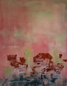 Auf meinem Bild ist der Hintergrund rosa mit ein bisschen grün drin. Man sieht im Vordergrund eine Fantasiestadt. Das ganze Bild ist sehr rosa gehalten. Die Stadt ist sehr fantasievoll gemalt und man erkennt nicht alles so gut. Ganz vorne sind die Häuser grau und schwarz. Die Häuser könnten auch ein grosses Schloss darstellen, wie es im Titel beschrieben ist. Das Schloss oder die Stadt ist nur in einem Drittel des Bilds gezeichnet, der restliche oberer Teil des Bilds ist nur mit dem Hintergrund bemalt, der eben rosa ist. In diesem Bild fühle ich verschiedene Gefühle. Es gibt mir ein bisschen Verwirrtheit, weil so viel los ist.