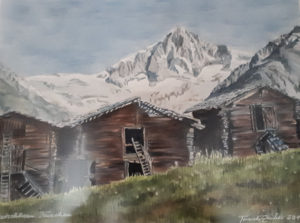 ♣ Das Bild wurde als Aquarell gemalt. Als erstes sieht man dort drei Holzställe. Diese Ställe benutzten früher oder immer noch die Bauern in den Bergen. Sie taten die Kühe unten rein und oben war dann Heu für die Kühe. Die Ställe sind aus braunem Holz gebaut und haben aus Steinen ein Dach. Diese Häuser haben in der Mitte eine quadratische Öffnung. Man kommt nur rein, wenn man mit der Leiter hochklettert. Jedes Haus hat eine Leiter. Unten ist eine Türe. Dort kann man ohne Leiter rein. Im Hintergrund sind grosse Berge, die mit Schnee bedeckt sind. Und im Vordergrund ist grünes Grass mit kleinen weissen Blumen. Ich persönlich kann den Duft der Alpen riechen, da ich selber schon in den Alpen war und das öfters. In den Alpen kann man mit Freunden oder der Familie spielen oder wandern gehen. Wassermann