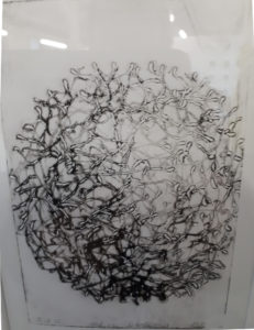 Auf dem Bild ist eine schwarz-weiße Kugel zu sehen, die aus vielen Strichen besteht. Das Bild ist wahrscheinlich entstanden durch zufälliges Zeichnen des Zeichners. Das Bild ist wahrscheinlich in die Ausstellung gekommen, weil der Zeichner es zur Verfügung gestellt hat. Nach der Ausstellung wird das Bild wahrscheinlich an den Zeichner zurückgegeben.