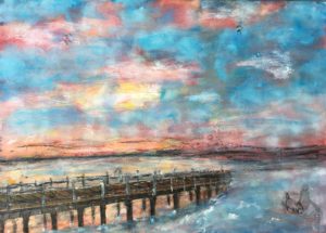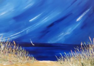 ♠ Ich gehe in die Kunstausstellung und sehe ein wunderschönes Bild. Es ist weiss, hellblau, dunkelblau, grün, rosa, pink, rot und gelb. Ein weisses Segelboot ist darauf zu sehen, Gras in allen Farben, gelb-weiss vermischter Boden, schwarz-dunkelblaues Wasser und ein hell-, dunkelblau weisser Himmel. Wenn ich es lange anschaue, denke ich schon fast, das Wasser bewegt sich. Es erinnert mich an Ibiza. Das Segelboot erinnert mich an die Croofrock. Das ist ein weisses Segelschiff mit diesem Namen. Die Schattierungen sind einfach wunderschön. Dieses Bild ist mit feinen Pinselstrichen gemalt. Es verzaubert mich einfach. Burgh