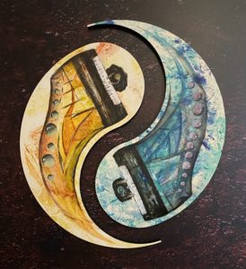 Ich erblicke ein Bänkchen, welches aber schon zugeschneit ist. Also die Option, eine Pause zu machen, fällt schon mal aus. Das macht mir eigentlich nichts aus. Ich könnte Stunden in diesem Wald verbringen. Die Zeit vergeht wie im Flug und ich stelle fest, dass mein Rundgang zu Ende ist. Ich entschließe mich nach Hause zu gehen. Langsam wird es doch recht frostig und mein Hund hat deutlich genug. Also machen wir uns auf zu meinem Auto. Obwohl ich dies nur für etwa eine Stunde allein liess, ist es komplett schneebedeckt. Ich wische mit meinem Ärmel den Schnee vom Griff der Autotür ab, öffne sie, richte die kleine, blaue Decke aus und platziere meinen frierenden Hund darauf. Mit einem zufriedenen Lächeln steige ich ein, starte das Auto und fahre der schmalen Kiesstraße mit geringer Geschwindigkeit entlang. Ich höre unter mir den überschneiten Kies knirschen. Die Laternen am Straßenrand bringen mich dazu, meine Augen zu zukneifen. Mein Heimweg wirkt nicht so wie immer. Ich kann es nicht beschreiben, doch irgendetwas fühlt sich seltsam an, aber nicht wirklich im negativen Sinne. yass[/vc_column_text][/toggle][toggle color=“Extra-Color-1″ heading_tag=“default“ heading_tag_functionality=“default“ title=“Sarah Huber, Flügel und Saitenliebe“][vc_column_text css_animation=“bounceIn“]♠ Im Bild ist das Zeichen Yin und Yang gezeichnet. Es hat zwei Punkte. In der linken Seite ist ein blauer Klavierflügel mit lila, blau türkis und grau. In der rechten Seite hat es einen orangen Klavierflügel mit den Farben orange, rot, gelb, rosa, schwarz und grau. Im Hintergrund ist alles schwarz, ausser in der unteren rechten Seite hat es noch rote Punkte. Ich denke, es könne ein Gefühl sein von Verliebtheit, Traurigkeit und Angst. Ich glaube es ist von einem Gefühl entstanden, das die Künstlerin gerade gefühlt oder gespürt hat. Ich glaube es ist so, wie wenn es Krieg gibt und zwei verlieben sich und sie können nicht zusammen sein. Das Bild kostet Fr. 1550.- Meine Meinung: Ich finde das Bild eines von den schönsten Bildern von der Ausstellung. Aber der Name sollte etwas sein mit Yin und Yang. Marmolarde