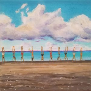 ♠ An einem warmen Sommertag lag ich am Strand und genoss die schöne Aussicht des Meeres. Ich roch den feinen Duft des Salzwassers, und spürte die warmen Sonnenstrahlen über mich gleiten. So ein schöner Sommertag. Plötzlich sah ich eine Gruppe von Menschen, die sich hintereinander aufstellten und etwas besprachen. Ich hörte richtig hin und erkannte die Sprache. Es war Schweizerdeutsch! Es waren junge Leute, zwischen 18- 20 Jahren und ein älterer Herr so Mitte 40. Er rief laut aus: ,,Hop!” Und alle machten einen Handstand. Es waren vier Mädchen und sechs Knaben, insgesamt zehn Personen, die einen Handstand machten. Sie sahen alle so fröhlich aus. Da musste ich sie einfach fotografieren. Zuhause habe ich es dann noch aufgemalt als Erinnerung. Handstand[/vc_column_text][/toggle][toggle color=“Extra-Color-1″ heading_tag=“default“ heading_tag_functionality=“default“ title=“Anja Vögeli, Tannenzweige und Momo“][vc_column_text]Webseite Anja Vögeli